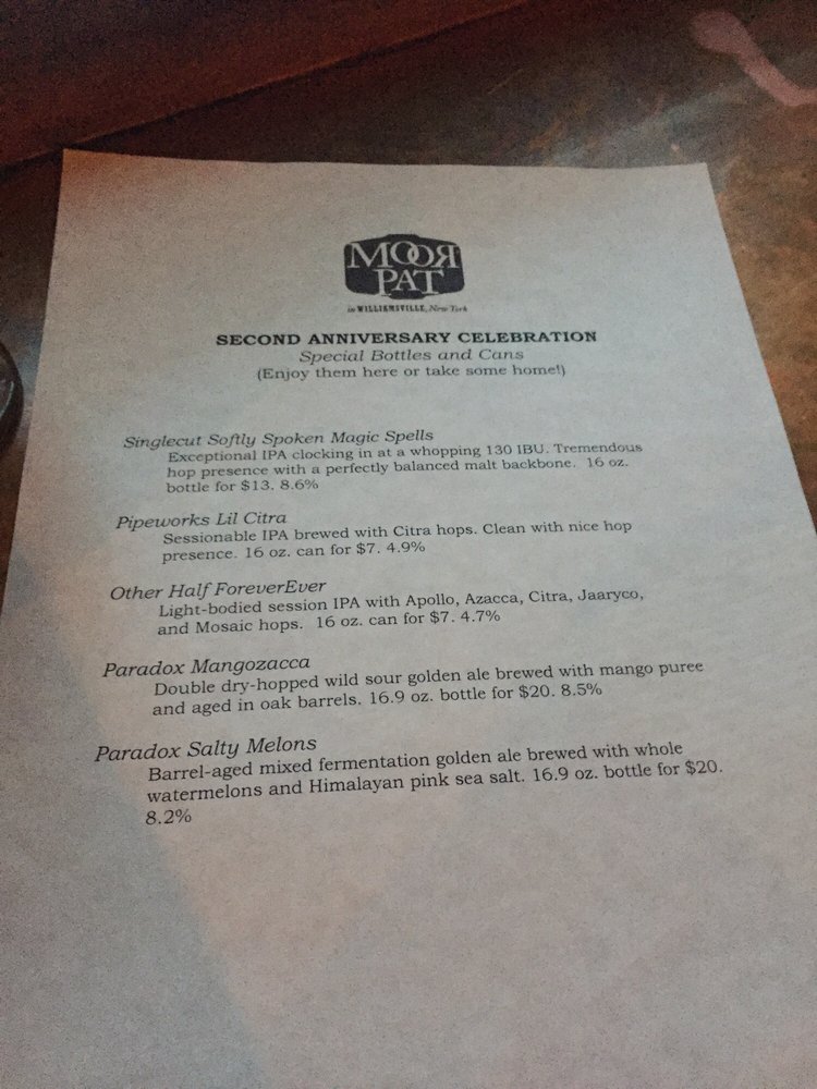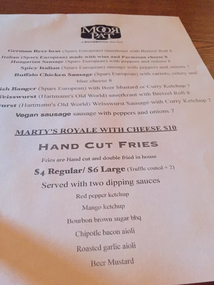 Introducing Moor Pat, located in Williamsville, NY, a cozy American bar known for its extensive beer selection. With a laid-back atmosphere, Moor Pat offers a variety of vegan and vegetarian options, making it a great spot for groups or a casual lunch. Highlights include crispy wings with flavorful sauces, such as the 718 sauce, and perfectly crispy fried pickles with pepper jack cheese. The casual vibe is complemented by outdoor seating and a full bar, making it ideal for a night out. While some customers have noted minor issues with service and overcrowding on certain nights, the overall experience at Moor Pat is enjoyable, with excellent beer choices and tasty dishes. Visit for a relaxed evening with good company and great food.